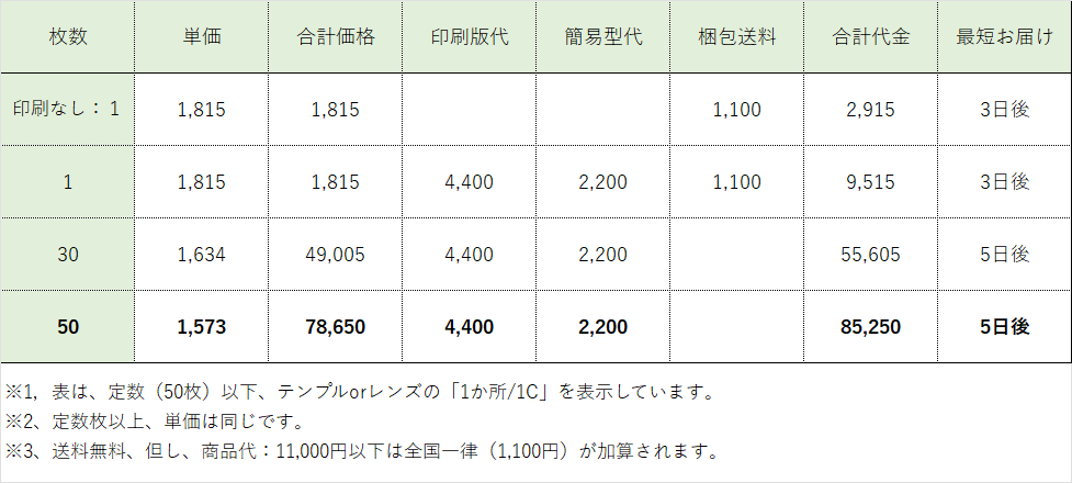 印刷場所:レンズ テンプル左右/内外のいずれか1ヵ所 ※追加印刷は追加計算になります。