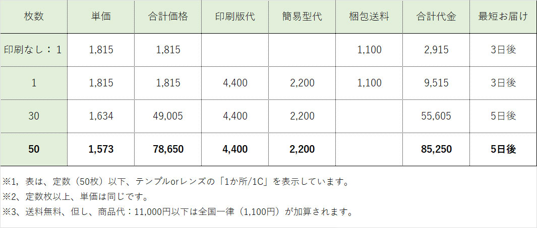 印刷場所:レンズ テンプル左右/内外のいずれか1ヵ所 ※追加印刷は追加計算になります。