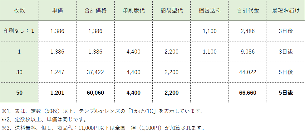 印刷場所:レンズ テンプル左右/内外のいずれか1ヵ所 ※追加印刷は追加計算になります。