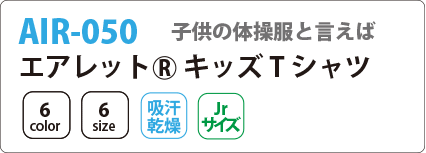 AIR-0505【子どもの体操服】(吸汗速乾)エアレットキッズTシャツ【日本製】 お子さんの着心地と快適性に寄り添った 保育園・幼稚園・小学校の体操服の定番です。 ◎吸汗速乾エアレット素材なので 洗濯後もすぐ渇き、連日使用できます。イズ展開・各価格(印刷なし枚単価) 【マルチナプリント代】 販売価格¥2,816.− /プリントなし単価種別・品番 AIR-050 サイズ:100~150 カラー ホワイト×グリーン ホワイト×オレンジ ホワイト×ブルー ホワイト×レッド ホワイト×バーガンディー ホワイト×ネイビー サイズ 100 110 120 130 140 150 印刷方法 1色/胸面 最大印刷範囲:W250×H200㎜(シルク印刷) 1色/背面 最大印刷範囲:W250×H200㎜(シルク印刷) 1色/肩面 最大印刷範囲:W100×H100㎜(シルク印刷) フルカラー//胸面 最大印刷範囲:W250×H200㎜(フルカラー印刷) フルカラー//背面 最大印刷範囲:W250×H200㎜(フルカラー印刷) フルカラー//肩面 最大印刷範囲:W100×H100㎜(フルカラー印刷) 印刷色 フルカラー 黒 赤 白 金 銀 その他 ご意見。ご要望 印刷代 印刷版代 【包装形態】 【サイズ】 【容量】 【品名】 AIR-050(吸汗速乾)エアレットキッズTシャツ【日本製】【品番】 AIR-050【素材】 ポリエステル65% 綿35% 生地定番<AIR-365>使用 ※東レ・完全中空ポリエステル原綿使用【カラー】 ホワイト×グリーン ホワイト×オレンジ ホワイト×ブルー ホワイト×レッド ホワイト×バーガンディー ホワイト×ネイビー【サイズ】 100 110 120 130 140 150【レンズの種類】 【レンズ枠】 【テンプル】 【可視光線透過率】 【紫外線透過率】 数量 在庫在庫有り カテゴリー:アパレル, 日本製, Tシャツ