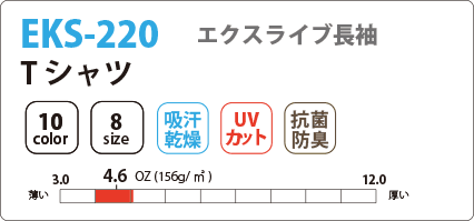 EKS-220・エクスライブ長袖Tシャツ【日本製】ポリエステル:100% 夏でも冬でも“エクスライブ” ハイスペックのTシャツ!◎吸湿発熱・速乾・抗菌防臭・UVカット・ ◎pHコントロールなど、多彩な機能性 ◎日焼け防止にも最適な長袖仕様【サイズ展開・各価格(印刷なし枚単価)】 【マルチナプリント代】 ※金額は、消費税込みの総額表示です。 上記金額は目安です。 正式にはお見積りにて提示させていただきます。 販売価格¥3,784.− /プリントなし単価種別・品番 EKS-220 ホワイト/カラー サイズ:SS~LLEKS-220 ホワイト/カラー サイズ:3L~5L カラー ホワイト サックス グレー ピンク グリーン カーキ ブルー レッド ネイビー ブラック サイズ SS S M L LL 3L 4L 5L 印刷方法 1色/胸面 最大印刷範囲:W250×H200㎜(シルク印刷) 1色/背面 最大印刷範囲:W250×H200㎜(シルク印刷) 1色/肩面 最大印刷範囲:W100×H100㎜(シルク印刷) フルカラー//胸面 最大印刷範囲:W250×H200㎜(フルカラー印刷) フルカラー//背面 最大印刷範囲:W250×H200㎜(フルカラー印刷) フルカラー//肩面 最大印刷範囲:W100×H100㎜(フルカラー印刷) 印刷色 フルカラー 黒 赤 白 金 銀 その他 ご意見。ご要望 印刷代 印刷版代 【包装形態】 【サイズ】 【容量】 【品名】 EKS-220・エクスライブ長袖Tシャツ【日本製】ポリエステル:100%【品番】 EKS-220【素材】 ポリエステル100% 生地定番<EKS-052>使用【カラー】 ホワイト サックス グレー ピンク グリーン カーキ ブルー レッド ネイビー ブラック【サイズ】 SS S M L LL 3L 4L 5L【レンズの種類】 【レンズ枠】 【テンプル】 【可視光線透過率】 【紫外線透過率】 数量 在庫在庫有り カテゴリー:プリント入りアパレル, 日本製, Tシャツ