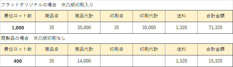 ・最低ロット数:フラットオリジナル(凸版印刷入り)と既製品(凸版印刷なし)で異なります。